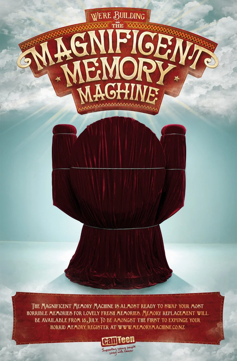 'The Magnificent Memory Machine' was invented for CanTeen, our charity client that supports young people living with cancer. The machine took bad memories that you typed directly into the machine, and replaced them with great new memories to make – in the form of a printed ‘ticket’. We created both a physical machine that people could activate using Facebook on their mobile as well as a Facebook version that took digital donations. The physical machine travelled around New Zealand expunging bad memories of Kiwis and raising awareness. The money collected by the machine was used to fund new, good memories for young people living with cancer.